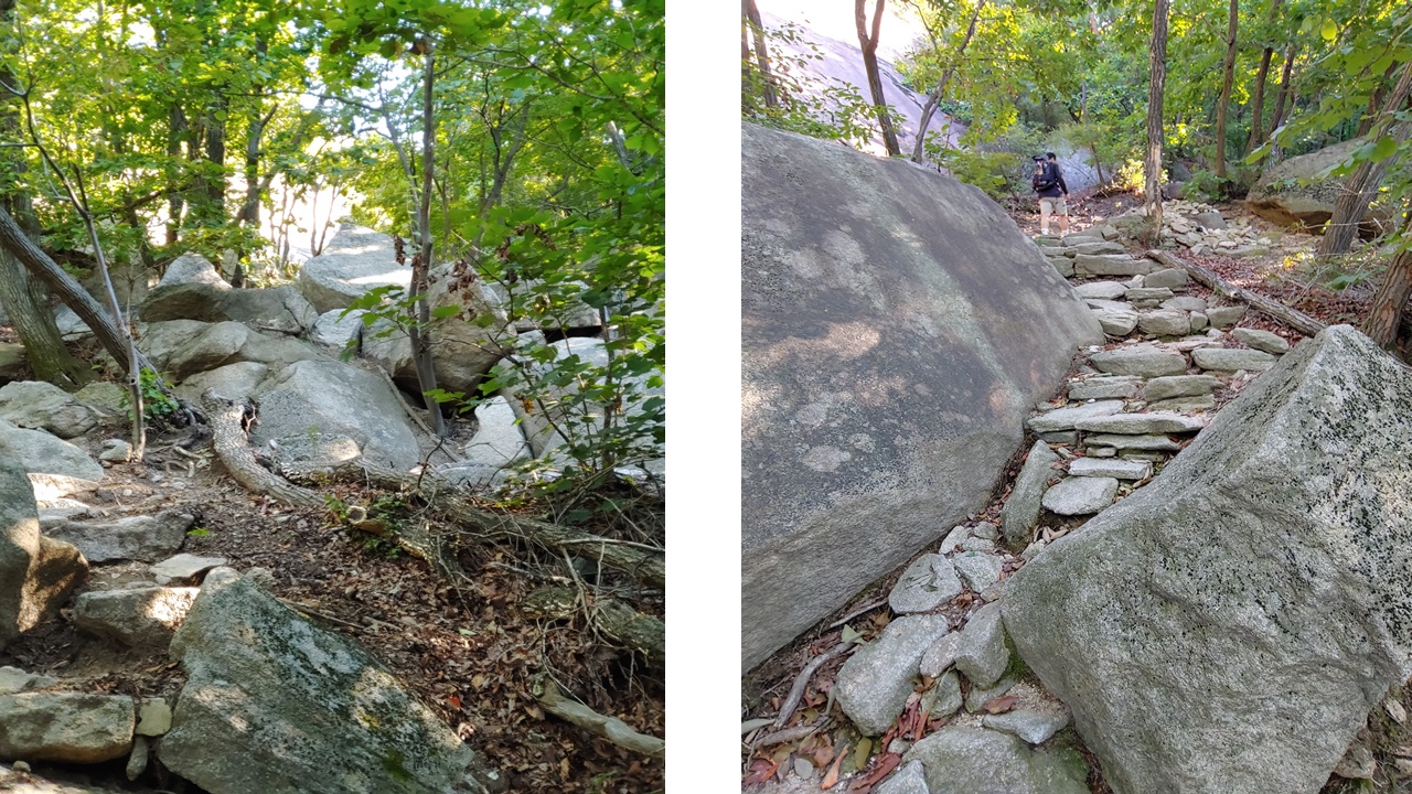 산을 오를수록 큰 바위들이 있습니다. 등산로는 주로 나무들 사이의 숲길로 되어 있어 따가운 가을 햇살을 피할 수 있어서 나무 그늘에 도움을 받아 등산을 할 수 있습니다. 무엇이 이 큰 바위를 둘로 쪼개는지... 사람의 기술인지 자연의 힘인지...???