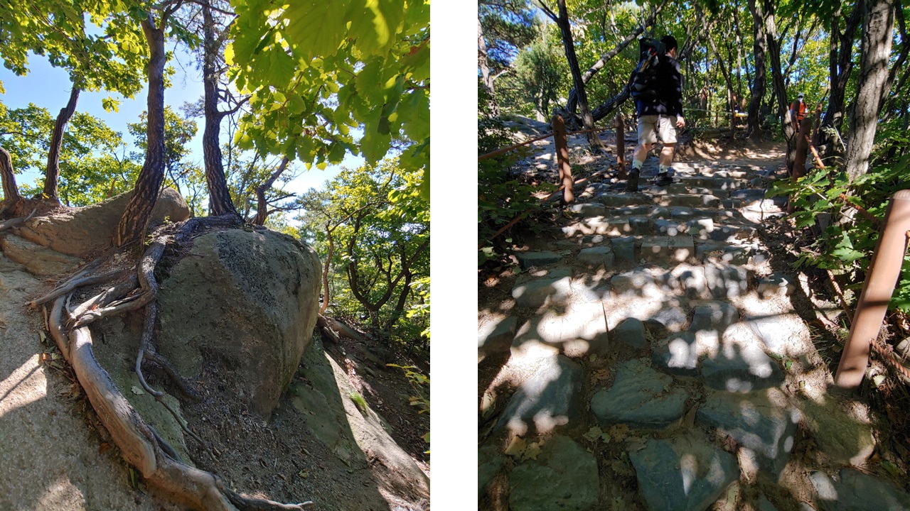 소나무가 바위를 감싸고 뿌리를 내려 있는 모습의 입니다. 소나무는 바위가 가로막아 뿌리를 내릴 수 없어 다른 방법을 찾은 것 같았습니다. 역시 자연에서 많은 것을 배우는 것 같습니다. 이 나무가 바위를 지나 뿌리를 내리 얼마나 많은 시간이 걸렸을까요?? 포기를 모르는 소나무입니다. 정상으로 향하는 길은 능선을 타고 가서 힘든 구간이 없습니다. 길도 정비가 잘 되어 있기도 하고요